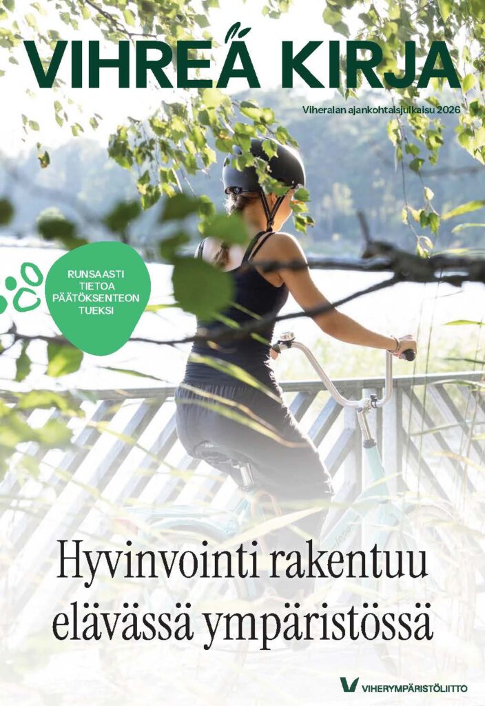 Vihreä kirja on Viherympäristö-lehden vuosittainen erikoisjulkaisu, joka tarjoaa tuoreita näkökulmia ja tietoa niin viheralan ammattilaisille kuin heidän sidostyhmilleen sekä yhteiskunnan päätöksenteosta vastaaville päättäjille. Esittelemme onnistuneita ratkaisuja, luomme verkostoja ja tavoittelemme yhdessä yhä parempaa rakennettua ympäristöä, joka tuo hyvinvointia kaikille. Nyt luettavissa on vuoden 2026 Vihreä kirja, jossa pääteemana on Viherympäristöliiton ja sen kumppaneiden Hyvinvointi rakentuu elävässä ympäristössä -kampanja. Miten kampanjan teemat koskettavat sinua? Haluaisitko osallistua tärkeiden viestien eteenpäin viemiseen? Tutustu ja tule mukaan!