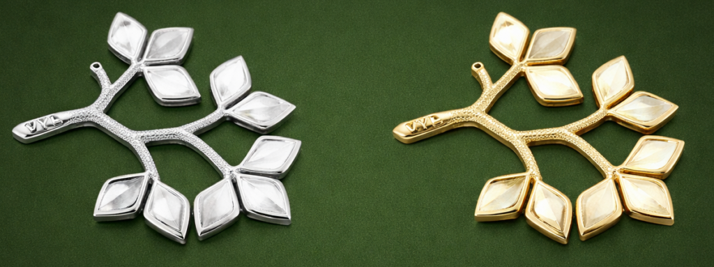 – Mallin ajatuksena oli kymmentä jäsenyhdistystä kuvaavat lehdet, jotka yhdistyvät toisiinsa Viherympäristöliittoa symboloivan oksan kautta. Ansiomerkin orgaanisessa oksassa ja pelkistetyissä ympäristöään peilaavissa lehdissä luonto ja kaupunki liittyvät urbaaniksi kokonaisuudeksi,” kertoo ansiomerkin muotoilija Tero Hannonen, Au3 Verstas / Au3 Kultasepät.