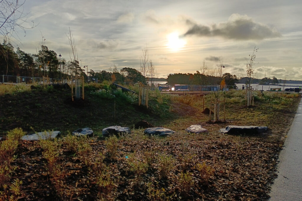 - Hulevesien luonnonmukaiset hallintaratkaisut: Hulevesiä hyödynnettiin kasvillisuusalueilla ja puiston länsireunaan rakennettiin hulevesipainanne.