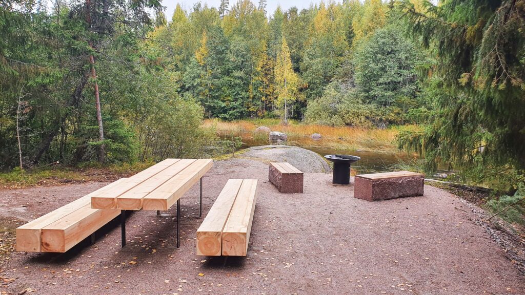 Ulkoilureitin taukopaikkojen kalusteet ja rakenteet on toteutettu käyttämällä paikallista urakoitsijaa sekä paikallisia ja kotimaisia materiaaleja. Alueen kaikissa kalusteissa ja pintamateriaaleissa on myös huomioitu kestävyys, esteettömyys ja käytettävyys.