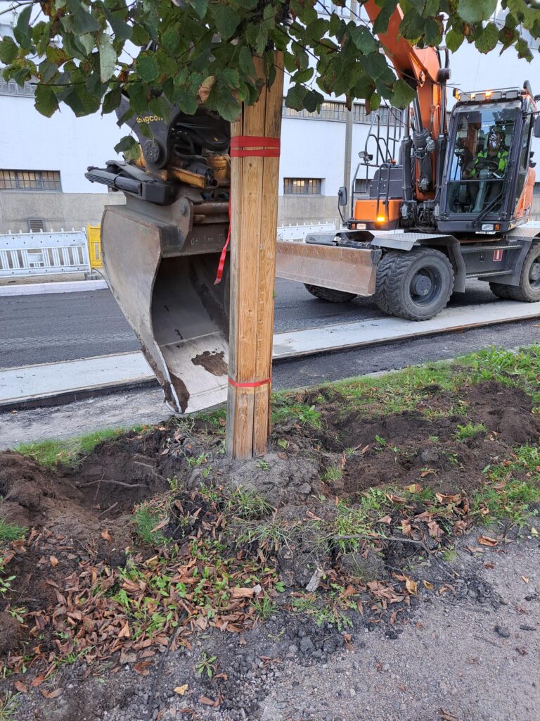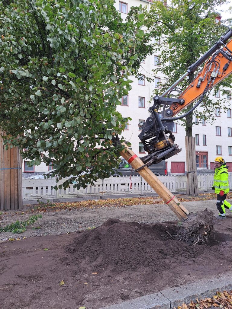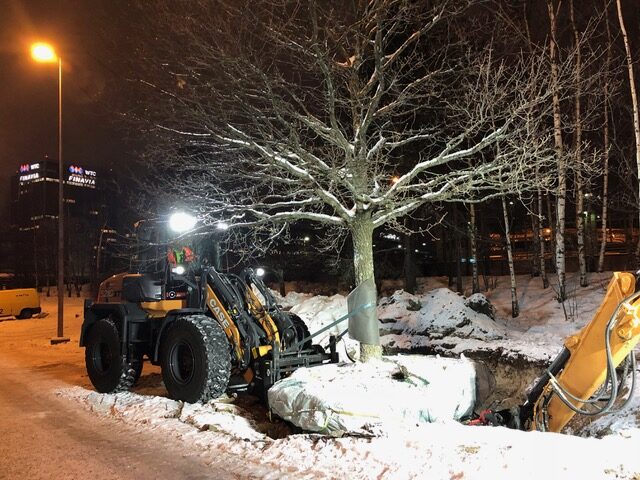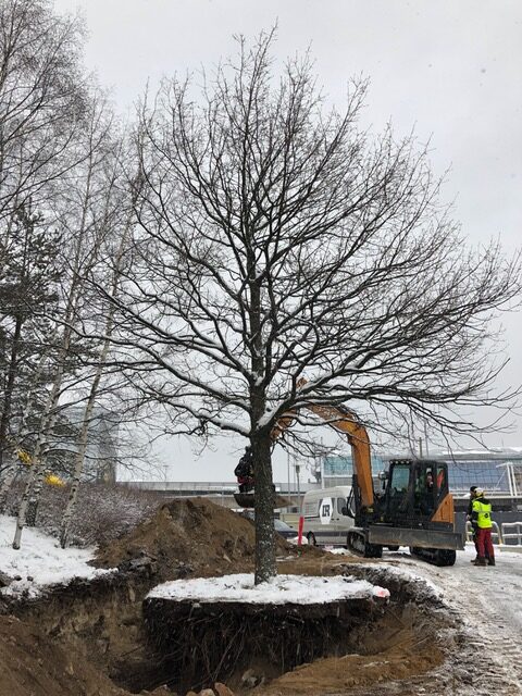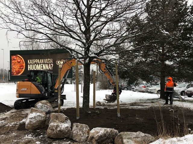 Rungon suojaamisen jälkeen kaivinkone irrotti puun varovasti maasta. Juuret katkaistiin siististi ja kone siirsi puun uudelle kasvupaikalle. Puu tuettiin neljällä tukevalla seipäällä ja kastelu aloitettiin heti. Keväällä kastelua jatketaan heti säiden salliessa.