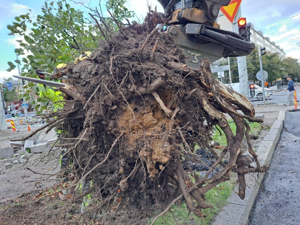 – Kun katsoo latvaan, näkee puun kunnon ja koon. Se, missä juuret kasvavat, selviää vasta kaivaessa. Siksi oli varauduttava kaikkeen. Siirto tehtiin keskitalvella.