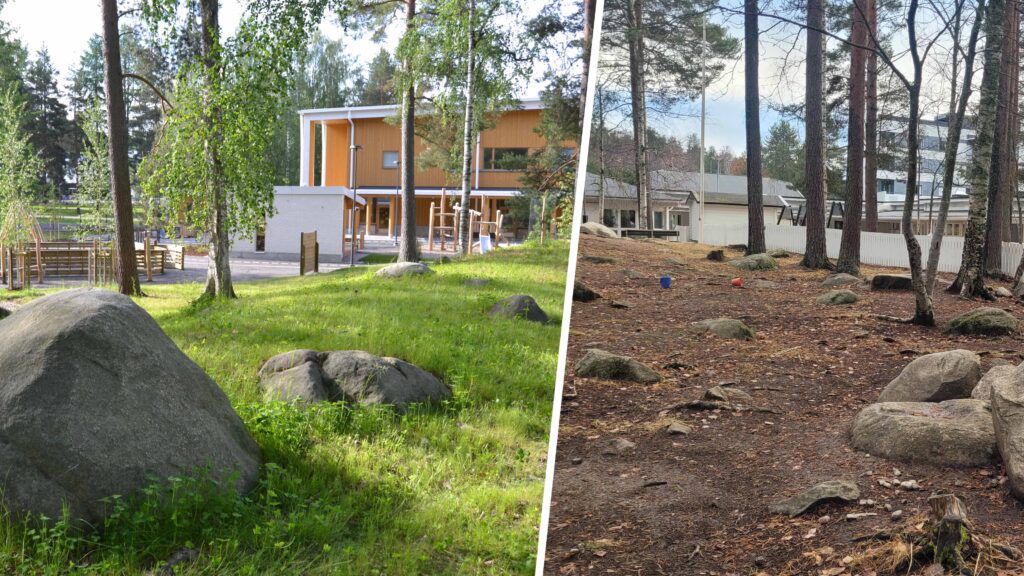 säilyttämällä vanhaa. Luontopohjaisten ratkaisujen toteutuminen voidaan varmistaa jo asemakaavoitusvaiheessa. Lohikosken uuden päiväkodin piha on Jyväskylän kaupungin Tilapalvelun pilottihanke, jossa kiinnitettiin erityishuomiota luonnonmateriaaleihin sekä nykyisen kasvillisuuden säilyttämiseen.