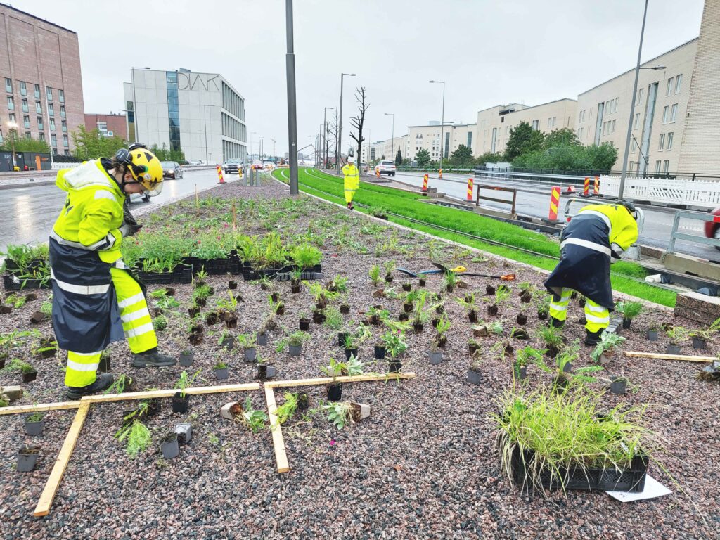 Ratikka-alueella hulevesien hallinta, puuistutukset ja viheralueet linkittyvät toisiinsa. Luontopohjaiset ratkaisut (viivytys, imeytys, viherrakenteet) ovat osa infran toimivuutta.