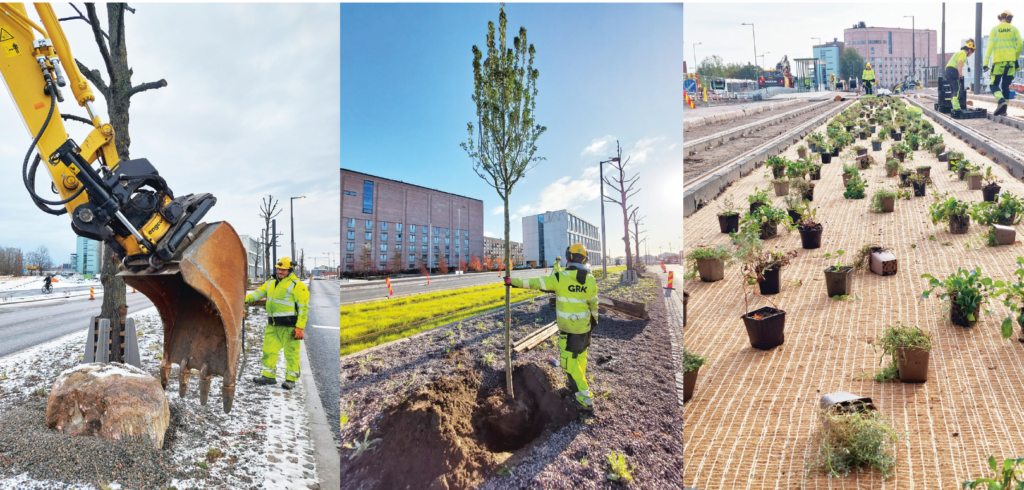 Saavumme Mäkelänkadun työmaalle. Liikenne soljuu eteenpäin määrätietoisesti, ja massiiviset koneet, kuorma-autot ja työntekijät rakentavat uutta kunnallistekniikkaa. GRK Suomen vihertyönjohtaja Sari Rinne on juuri päättänyt työmaakierroksen, jossa on käyty läpi katuvihreään liittyviä teknisiä työvaiheita yhdessä vihervalvojan kanssa. Se, että vihertyönjohto on mukana urakan alusta lähtien, vaikuttaa ratkaisevasti lopputulokseen.