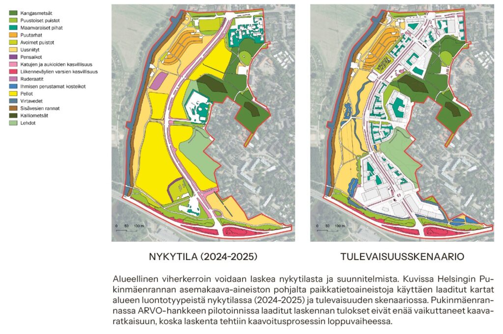 Luontotyyppien osalta luonnon luontotyypit on Suomessa vakiintuneella tavalla määritelty, mutta alueellisen viherkertoimen laskennan perustaksi ARVO-hankkeessa määriteltiin rakennetun ympäristön luontotyypit ja niiden ekologisen tilan mittarit. Työ tehtiin yhteistyössä BOOST-tutkimushankeen ja laajan asiantuntijaryhmän kanssa kuuden työpajan sarjassa 11/2024–9/2025. Kesällä 2025 kuvausten ja mittaristojen toimivuutta testattiin maastotyöskentelyssä, josta ensimmäisiä tuloksia on jo julkaistu (Puolitaival ym., 2025).